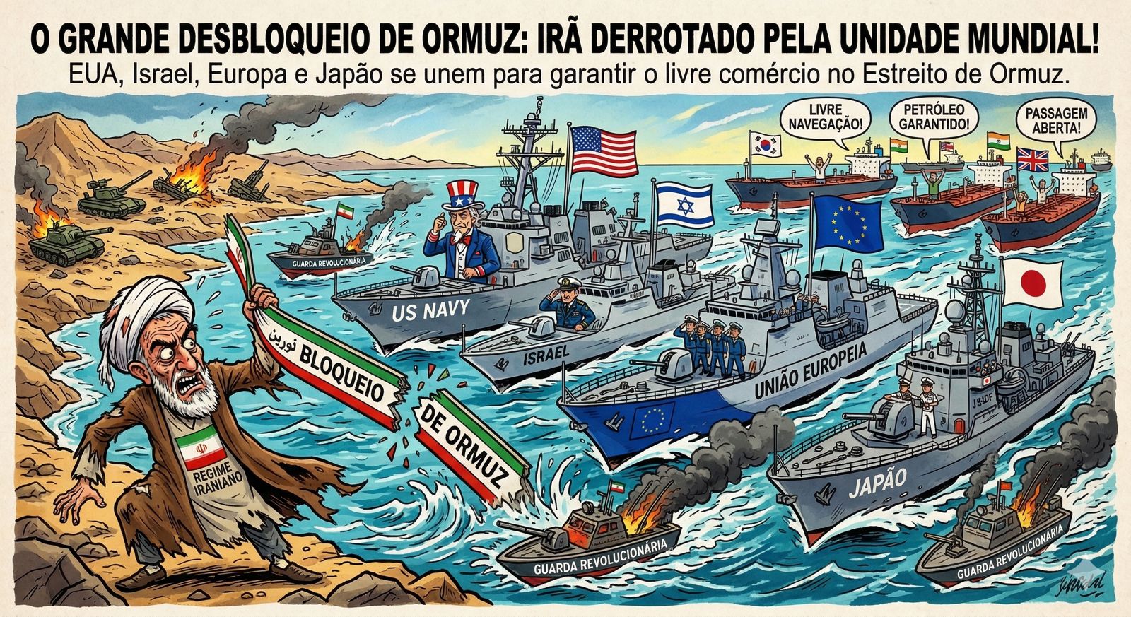 Os governos da França, Reino Unido, Alemanha, Itália, Países Baixos e do Japão publicaram nesta quinta-feira (19) uma declaração conjunta manifestando disposição para abrir o Estreito de Ormuz, fechado pelo Irã após o início da guerra.